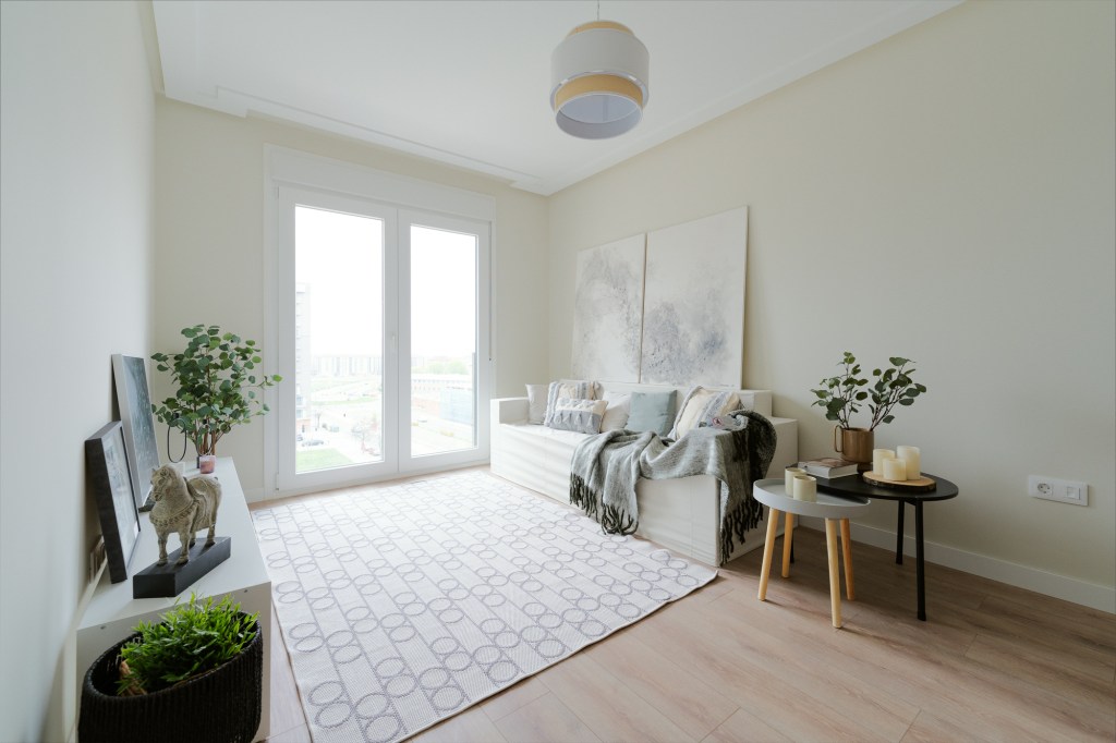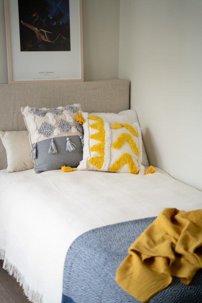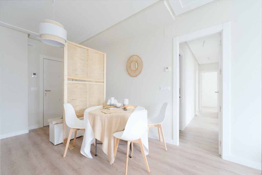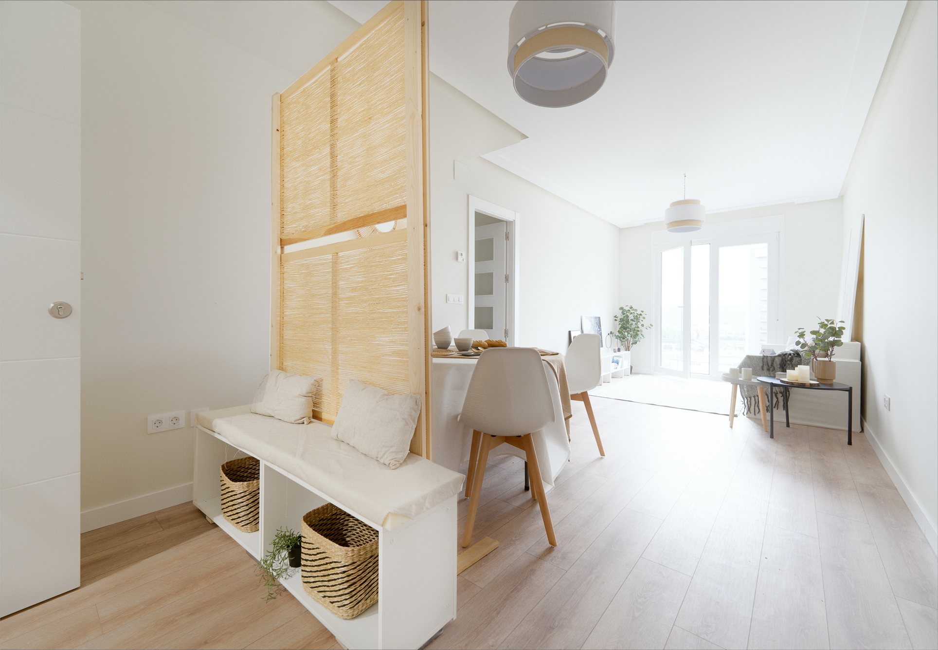 Este bonito y luminoso piso de reciente construcción está en el barrio próximo al campus Universitario de León. Es una zona familiar donde las edificaciones cuentan con un sinfín de mejoras siendo viviendas más eficientes a nivel energético con muy poco consumo. Con sus grandes ventanales aprovecha todo el sol y la luz que recibe en el día, su orientación y la cercanía de todos los servicios hacen de este piso una muy excelente opción para comprar un hogar a estrenar. Hemos mimado cada rincón y sus particularidades, como éste separador de ambientes realizado artesanalmente «ad hoc» con 600 metros de cuerda de cáñamo natural.